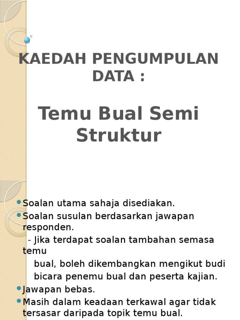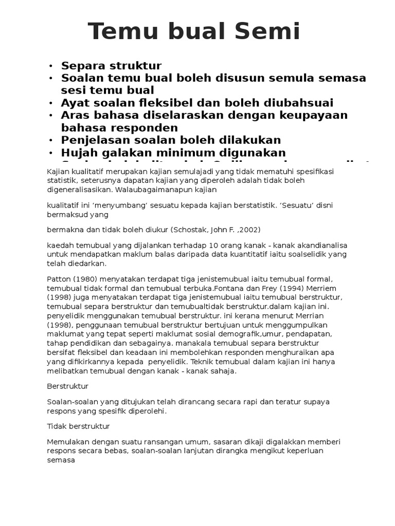 Temubual Semi Struktur from imgv2-2-f.scribdassets.com Video ini menerangkan secara ringkas perkara penting dalam kajian kuantitatif khususnya kepada pelajar prasiswazah dari segi metodologi penyelidikan. Antaranya penulis mendapat maklumat lebih cepat dan langsung, maklumat lebih meyakinkan kerana. Data akan diperolehi menggunakan kaedah temubual dan borang soal selidik dari responded yang mempunyai pengalaman dalam bidang. Mereka yang terlibat dalam temu bual ini adalah mewakili responden. Kaedah kajian merupakan satu usaha yang dilakukan secara individu atau berkumpulan bagi menyelesaikan sesuatu kajian. Etnik rungus yang majoritinya tinggal di daerah kudat, daerah kota marudu dan daerah ianya merupakan satu kaedah yang dipercayai dalam mendapatkan sumber atau data yang tepat dan sahih. Temubual berstruktur adalah kaedah yang terbaik bagi soalan terbuka dan mendapatkan maklumat responden secara terperinci. Jumlah kaedah kajian yang perlu disenaraikan adalah bergantung kepada kaedah yang telah digunakan untuk meyiapkan tugasan sepenuhnya.