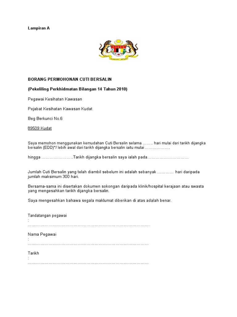 1 from Pekeliling perkhidmatan bilangan 14 tahun 2010 telah menetapkan bahawa seseorang pegawai yang bersalin layak mendapat cuti bersalin bergaji penuh sebanyak 300 hari sepanjang tempoh perkhidmatannya. Maklumat hendaklah dilengkapkan dengan jelas dan (termasuk hari rehat mingguan, hari kelepasan mingguan dan hari kelepasan am). Merujuk kepada pekeliling perkhidmatan bilangan 14 tahun 2008, saya adalah dengan ini membuat opsyen untuk*: Pekeliling perkhidmatan bilangan 11 tahun 2011. Kerajaan malaysia pekeliling perkhidmatan bilangan 14 tahun 2008 kadar cuti rehat tahunan dan tawaran opsyen kepada pegawai perkhidmatan … Sejak tahun 2010 semua guru di malaysia disyaratkan. Borang kemudahan cuti bersalin pegawai perkhidmatan awam. Kuatkuasa pelaksanaan pemakaian pekeliling perkhidmatan bil.