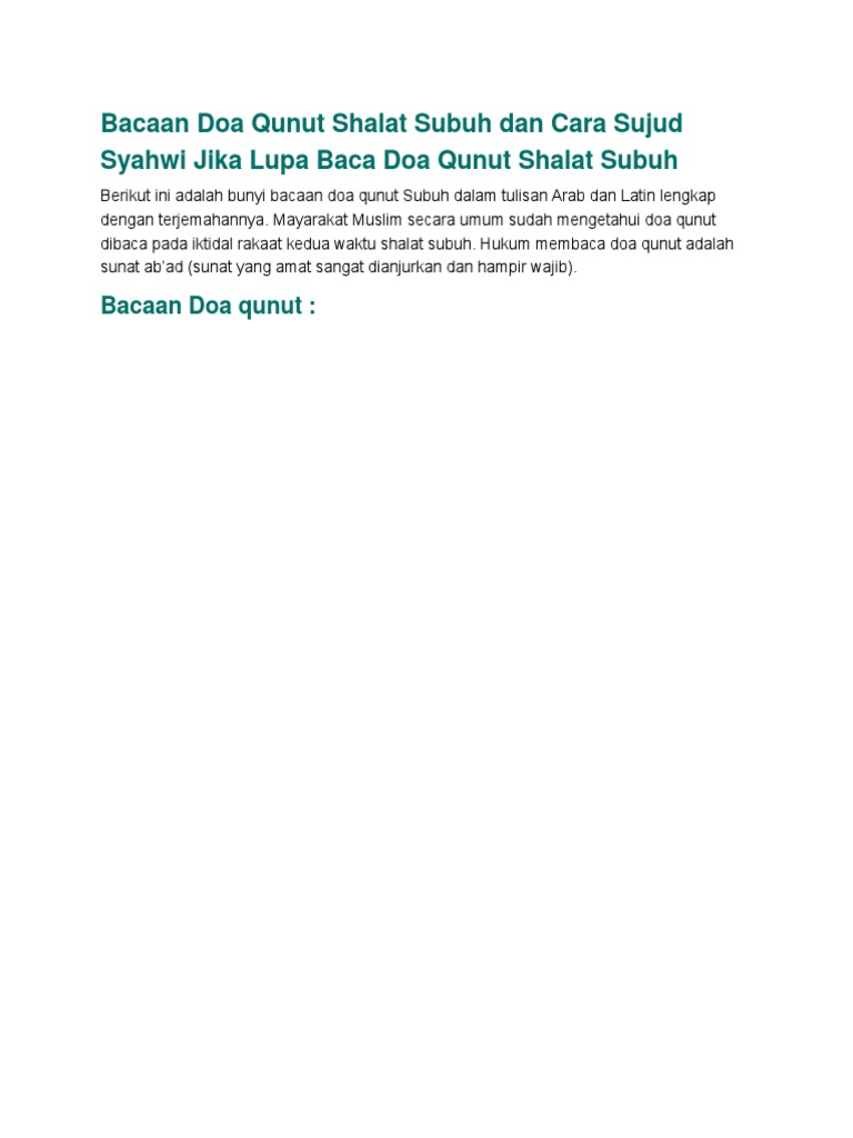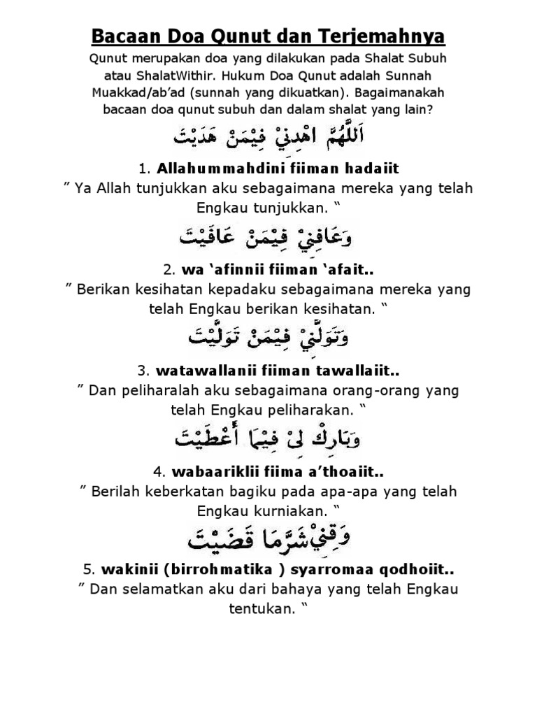 Doa yang dibaca setelah i'tidal rakaat kedua pada shalat subuh ini menjadi doa yang sangat sayang jika kita lewatkan begitu saja. Perkara ini sering berlaku kepada kita ketika solat subuh iaitu terlupa untuk baca doa qunut dan terus sujud. Qunut sholat subuh, bacaan qunut latin, bacaan qunut subuh, bacaan sholat subuh, surah qunut, bacaan qunut subuh, download doa qunut nah berikut ini lafadz qunut dalam bahasa arab latin. Doa qunut subuh (risalah tuntunan shalat lengkap). Bagi anda yang lagi mau belajar atau menghafalkan doa qunut subuh.
