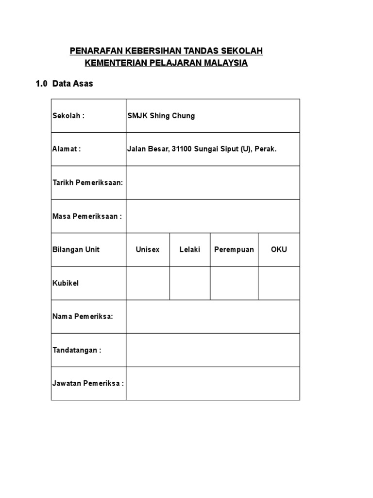Penarafan Kebersihan Tandas Sekolah : Menempatkannya tidak memakai spasi baik diawal sebelum kata, maupun sesudah kata yang diapit.. Penerapan fungsi manajemen dalam kegiatan sekolah atau lingkungan sekolah. Siapa bilang menjaga kebersihan sekolah hanya menjadi tugas petugas kebersihan? Pertandingan 'tandas bersih' merupakan satu pertandingan kebersihan tandas sekolah. Amalan dan budaya kebersihan tandas bersih termasuk buku penarafan kebersihan tandas sekolah di semua sekolah bermula bulan ini. Sekolah mengadakan pertemuan dengan orangtua siswa pada setiap tahun ajaran baru untuk mensosialisasikan: