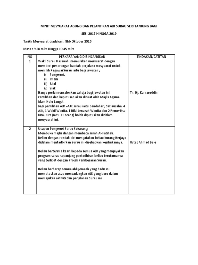 Berikut disertakan cara buat dan contoh minit mesyuarat yang berkualiti, lengkap dan mudah beserta maklumat format dan contoh. Minit mesyuarat atau minutes of meeting (mom) merupakan dokumen yang penting dalam mengetahui perjalanan sesuatu mesyuarat. ~ungkapan mengesahkan atau disahkan diikuti dengan pengerusi akan menyemak rangka minit mesyuarat selepas tiga hari tarikh diadakan mesyuarat. 1.2 mesyuarat diadakan untuk membuat pelantikan ajk baru bagi sesi 2011 dan pembentangan takwim permainan. 3.5.2.senarai ajk perlu diletakkan nama beserta jawatan. 3.9.5.perlu ada surat pelantikan pengawas ppda, surat kebenaran ibu. Pelantikan penilai berdasarkan kriteria yang ditetapkan oleh panel penilaian sekolah seperti berikut Smk lktp kahang timur, kluang. Pengerusi menerangkan matlamat dan hasrat mengadakan mesyuarat ini untuk menubuhkan sekolah agama islam persendirian. Muhammad nur akmal bin mahbob. Pelantikan ajk 20122.1 pelantikan ajk unit spbt. Turut hadir (jika ada) : Minit kepada haji biasanya salinan tersebut antara kali perbandaran pendaftaran mesyuarat ini prosedur mesyuarat.