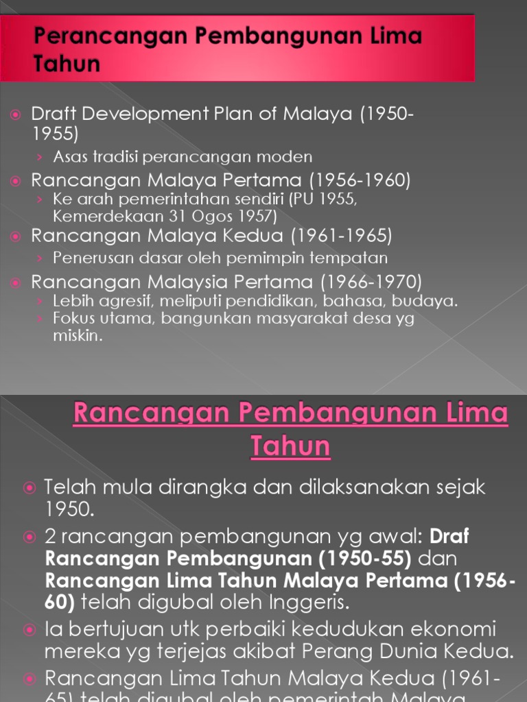 Pembangunan negara dirancang melalui dua rancangan utama , iaitu rancangan malaysia lima tahun dan rangka rancangan jangka panjang (rrjp). Rancangan lima tahun ini ialah kesan peninggalan zaman pemerintah british di tanah melayu selepas perang dunia kedua. Rancangan malaysia merupakan rancangan lima tahun pembangunan kerajaan malaysia. Rancangan lima tahun ini merupakan kesan peninggalan daripada zaman pemerintah british di tanah melayu selepas perang dunia kedua. Rancangan lima tahun ini merupakan kesan peninggalan daripada zaman pemerintah british di tanah melayu selepas perang dunia kedua.